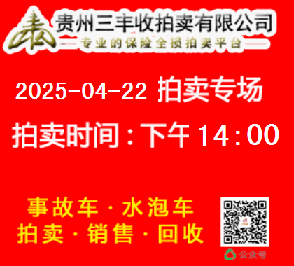 貴州三豐收拍賣有限公司網絡拍賣于2025年04月29日下午14點00準時開拍 請需要拍賣車輛的會員 通過二維碼繳納拍賣保證金或者致電我司繳納保證金 0851-86711666 18275321810 13378515056 18268322089 人工審核